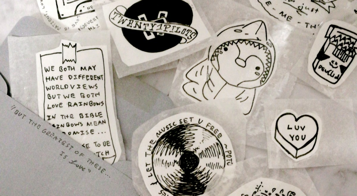 Draw your desired content onto the piece of paper using an ink pen. Cut them out in the shape you would like your sticker to be.