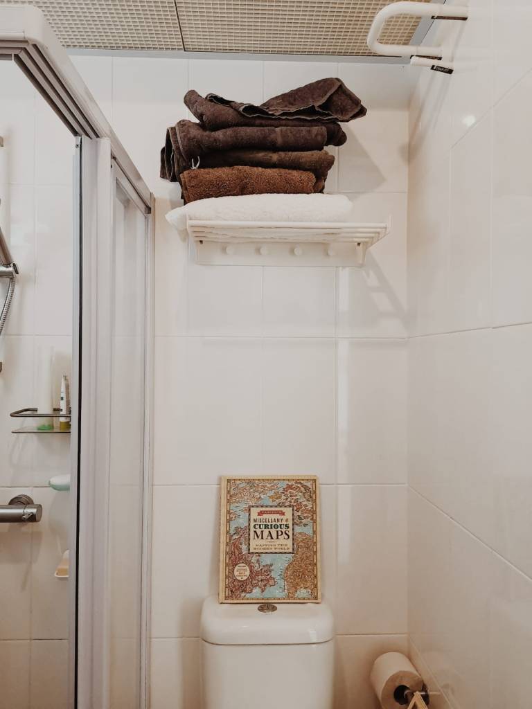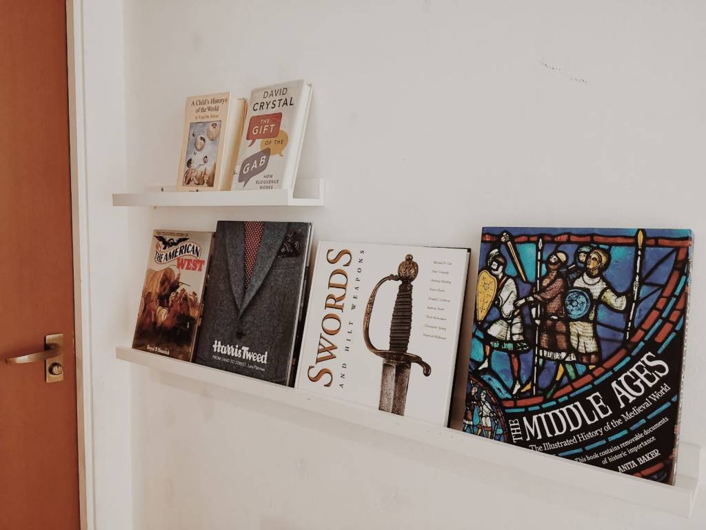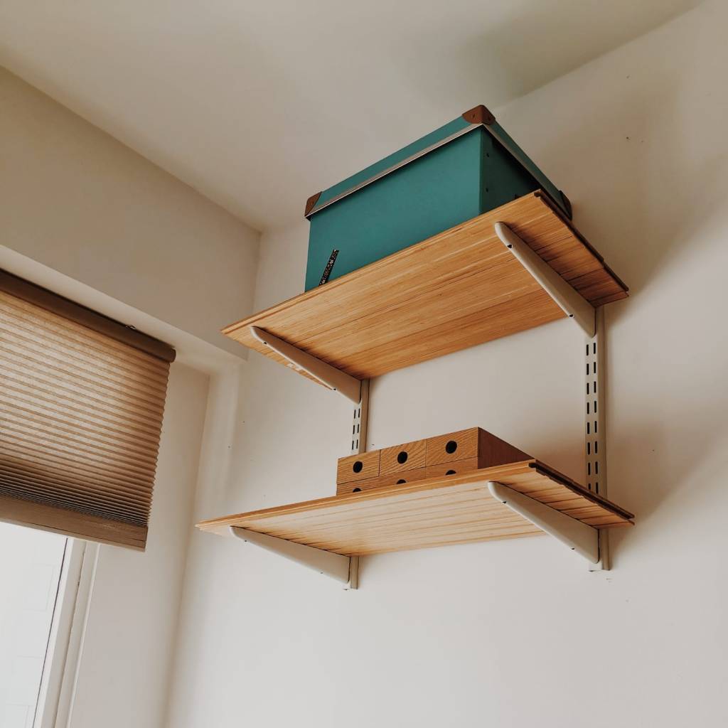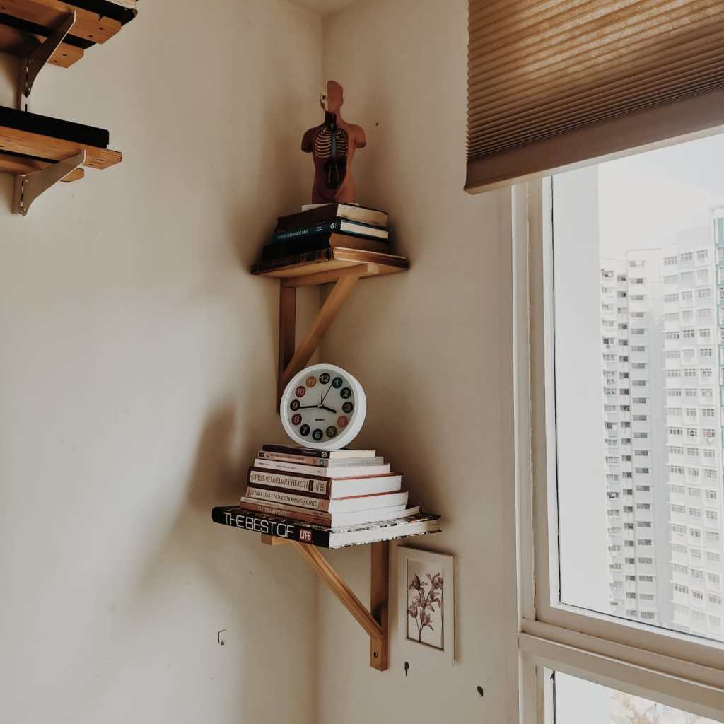 These are literally book-shelves that I made; $5, just nailed to a book, these are brackets from Daiso, $2. So we don’t have expensive furniture; we have a nice floor, and that accentuates everything. The floor is the most expensive thing in the house, it doesn’t feel plasticy, so that’s important, as well.