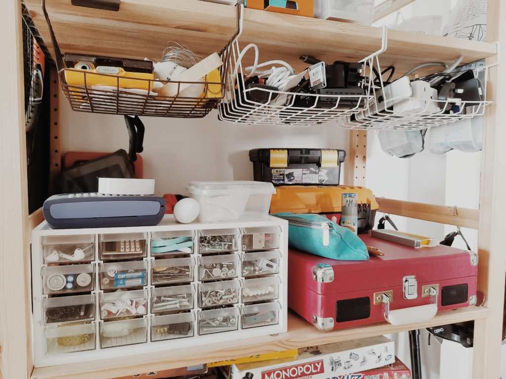 This one I found in IKEA, this is where I usually hang my cables, and bags. Another way of budget saving it to have everything out; nothing in the cupboards; so that I don’t hoard, and I can’t say “Oh I don’t have this, need to go and buy..”, I can see everything I have, and If I don’t use it, I either throw away, or I use it. So budgeting is not buying anything unnecessary that you don’t need. Currently, there’s a shelf here, it’s got everything we need; tools, games, shoes; and it allows me to see maybe we’ve got too many shoes–anything that doesn’t fit, we have too many, then we have to figure out how to use it.