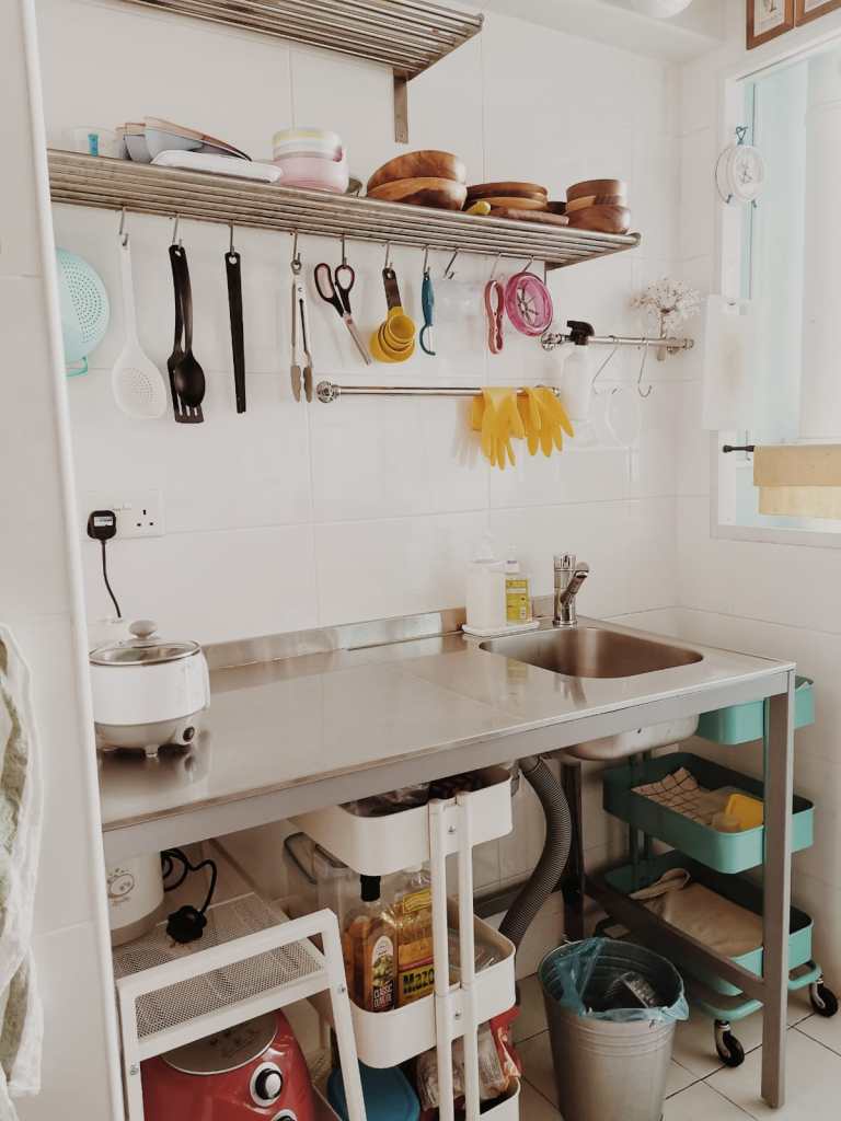 The kitchen’s also my workspace, and then I have my coffee corner, I can do my work; it’s high enough so that the baby can’t get to the things. So everything again is modular, a lot of things are on wheels. This is where we keep all the food, and this is dish-drainage; just line it up with a cloth. And again, it’s about the function: this trolley can be used for anything, so in this season it’s a dish-drainer, I just use extra dishcloth–I don’t have to buy a dedicated dish-drainer. So it’s very simple, life is very simple; everything is open shelf, again, I can see what I have and don’t have, it allows me to declutter and it allows me to take things easily.